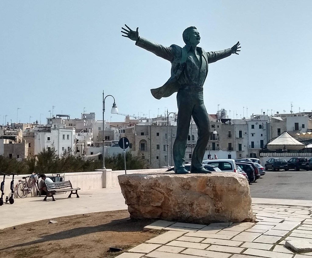 In ogni caso il sole è alto e la giornata si presenta piacevolissima. Rimediato con gli interessi al bar il caffè mancato di stamattina, e ritirati i passaporti da far timbrare al raggiungimento di ogni tappa, siamo pronti a dare inizio al rituale che segna l’inizio della Rotta dei due mari: scendere sulla spiaggia di Lama Monachile e scegliere un sassolino a testa, da portare nello zaino fino alla nostra destinazione; ritornare in paese per omaggiare Domenico Modugno, che distende benaugurante le braccia spiccando il volo verso l’entroterra; e ritornare vicino alla spiaggia per iniziare a seguire le indicazioni rossoblù e le frecce azzurre a forma di onda che segnano il cammino.