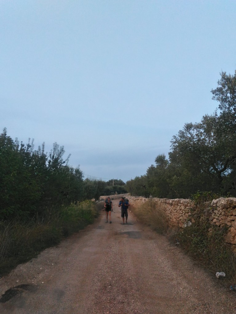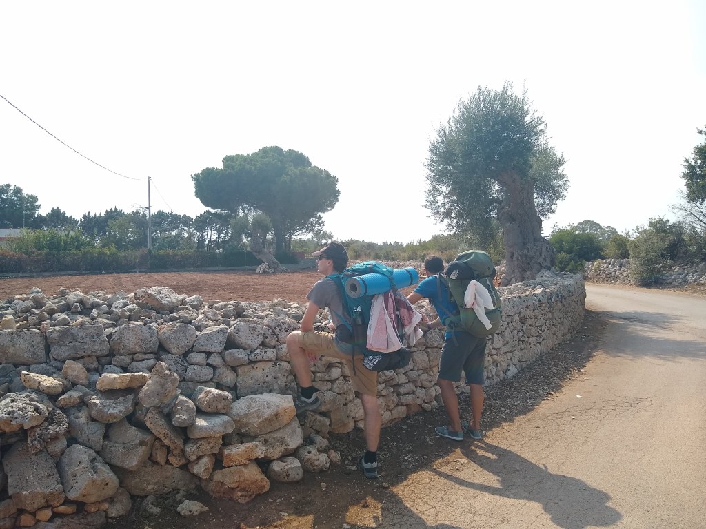 Luana e Luca scendono ridendo dalla Panda di lei, arrivata fieramente a destinazione dopo un giorno di viaggio da Parma all’Auchan di Taranto. Mi fanno un po’ strano due volti conosciuti dopo tre giorni di solitaria on the road avanti e indietro per la Puglia: da adesso e per una settimana condivideremo 120 chilometri di cammino dall’Adriatico allo Ionio, ed il viaggio di ritorno da qui all’Emilia.