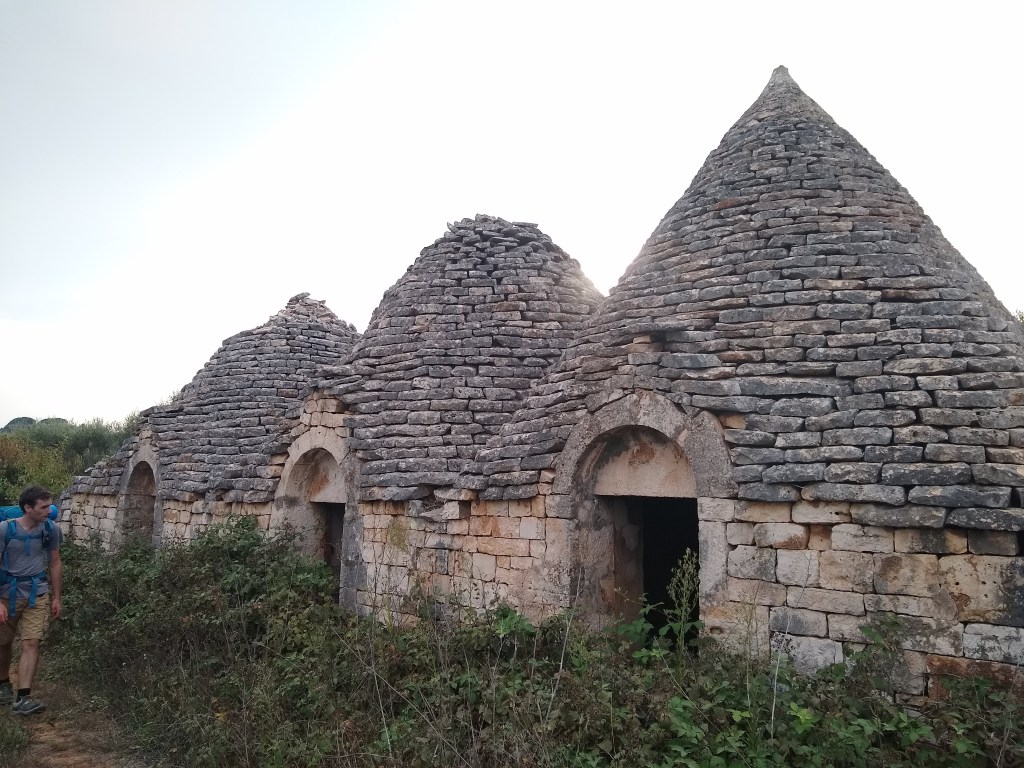 Vuoi per il potere benefico di certi incontri, vuoi perché siamo già al secondo giorno, il cammino di oggi si fa sentire meno su spalle e gambe ed arriviamo ad Alberobello prima di sera: sorridenti e sicuri nonostante il bisogno di una doccia, il non sapere ancora dove passeremo la notte e, ultimo ma non ultimo, il temporale di nuovo in arrivo.