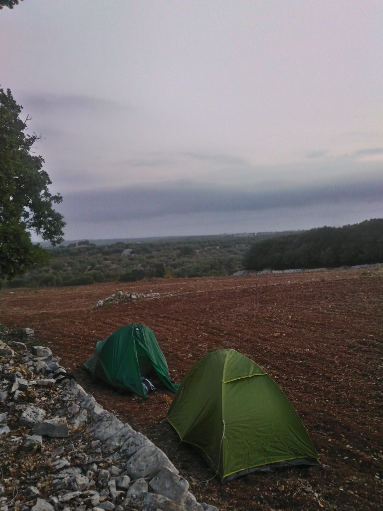 Alla fine manchiamo la prima tappa di due chilometri, iniziando a cercare un posto per la notte tra i primi trulli che incontriamo e i campi arati: la scelta ricade su piantare le tende su un terreno abbastanza isolato, affacciato sulle campagne appena superate.