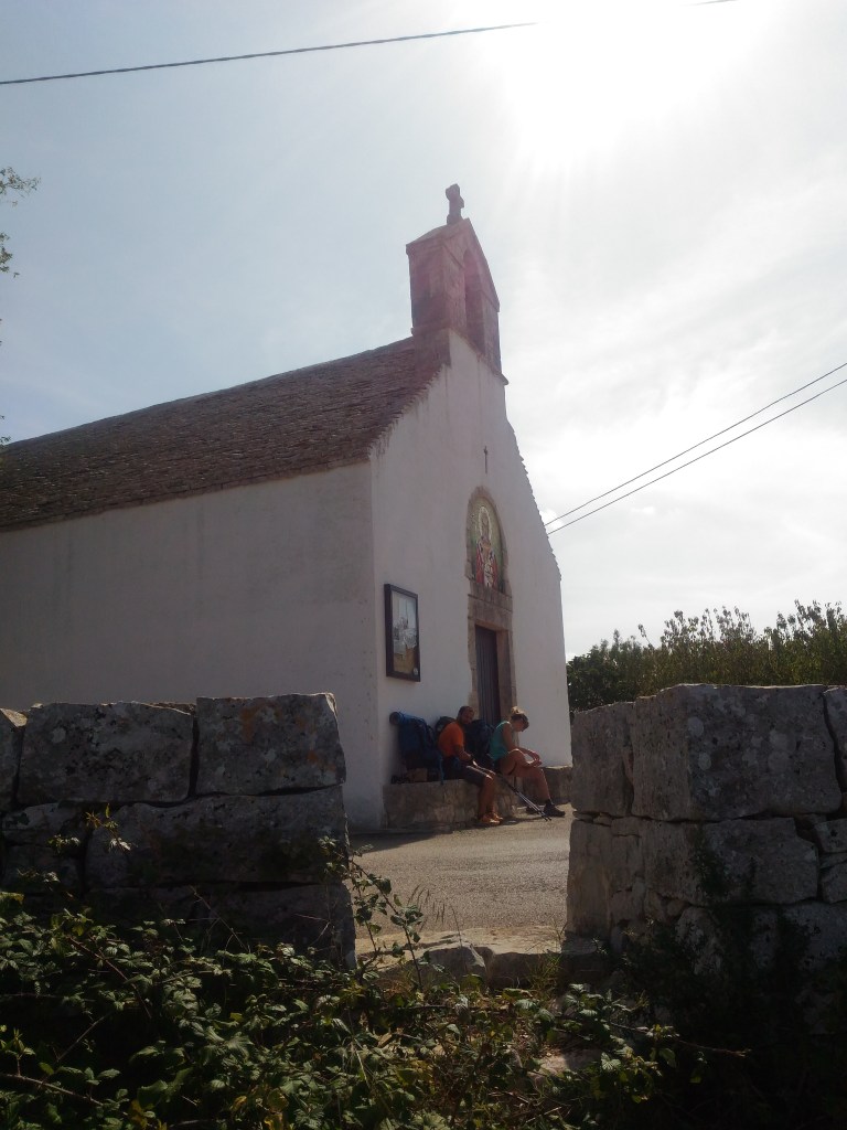 Dopo l’arrivo trionfante di ieri sera pareva che non saremmo riusciti a mettere un piede davanti all’altro per un altro giorno. Ma un sonno ristoratore e la prospettiva del traguardo ormai vicino possono fare miracoli: allora ci guardiamo per la quinta volta indossare le scarpe e buttare lo zaino sulle spalle, per uscire verso campi, muretti e, per non farci mancare nulla fino in fondo, nuvole cangianti e minacciose.