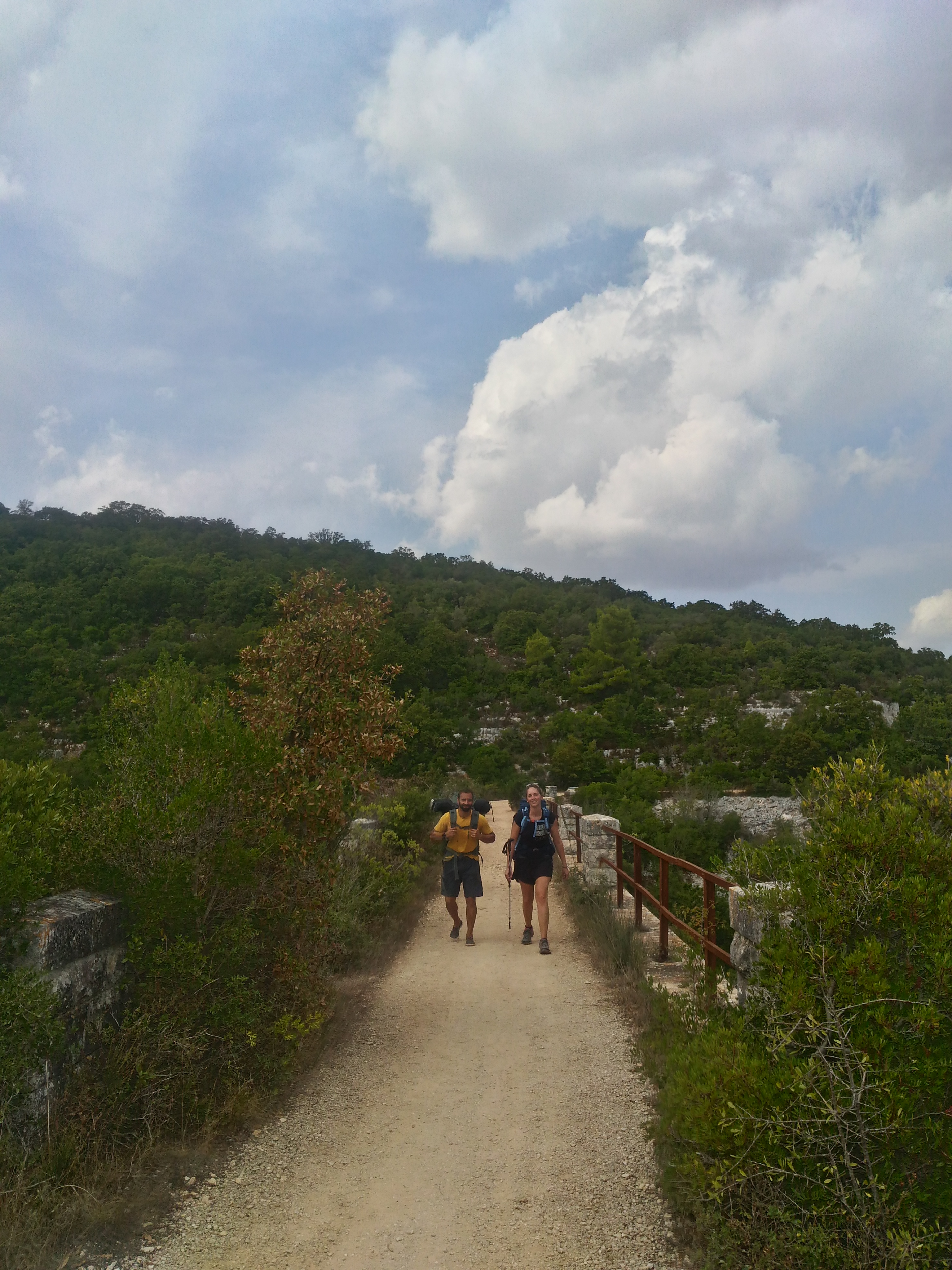 Siamo silenziosi negli ultimi chilometri, ognuno concentrato sul mettere un passo davanti all’altro fino all’ultima tappa o sulle nuvole che promettono un altro breve temporale prima di raggiungere il castello; forse anche ai miei compagni scorrono davanti anche le immagini di questi cinque giorni, questa regione non nostra con le sue contraddizioni e i suoi alti e bassi, i rifiuti a fianco delle strade, i grandi ulivi, i suoi sorrisi, i suoi muretti, la sua voglia di chiacchierare nella sua lingua e la sua frutta invitante a bordo dei campi. Il suo saperti accogliere senza giri di parole e senza benvenuto, semplicemente facendoti sentire che ci sei.