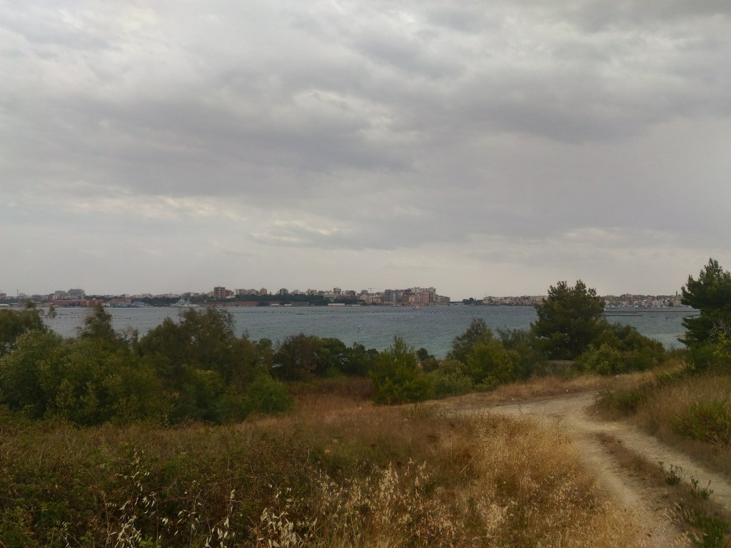 Dopo le prime ore di cammino scorgiamo i due mari di Taranto dall’alto degli ultimi, larghi campi da superare, con l’erba bruciata dal sole e la terra fine cosparsa di sassi.