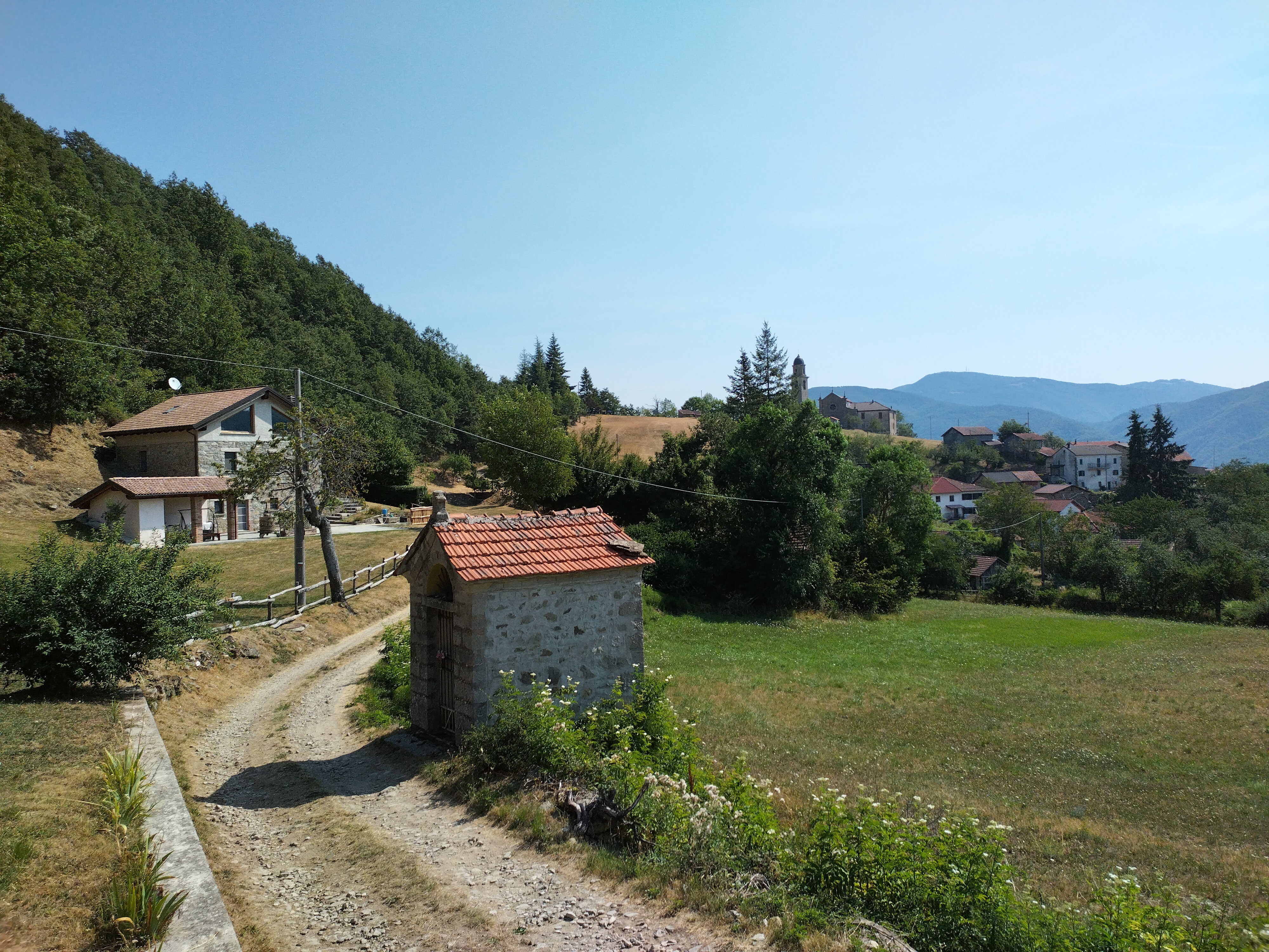 La risalita a fianco del cimitero e lungo le colline affacciate sul Tarodine ricalca il tratto di Via degli Abati che da qui raggiunge Pontremoli. Le due vie si separano una volta superato l’abitato di San Vincenzo in località La Caminata. È qui, davanti a una bella maestà del 1706 nel centro del piccolo borgo, che vengo richiamato allegramente da un “Mamma, vieni che c’è un pellegrino!”.