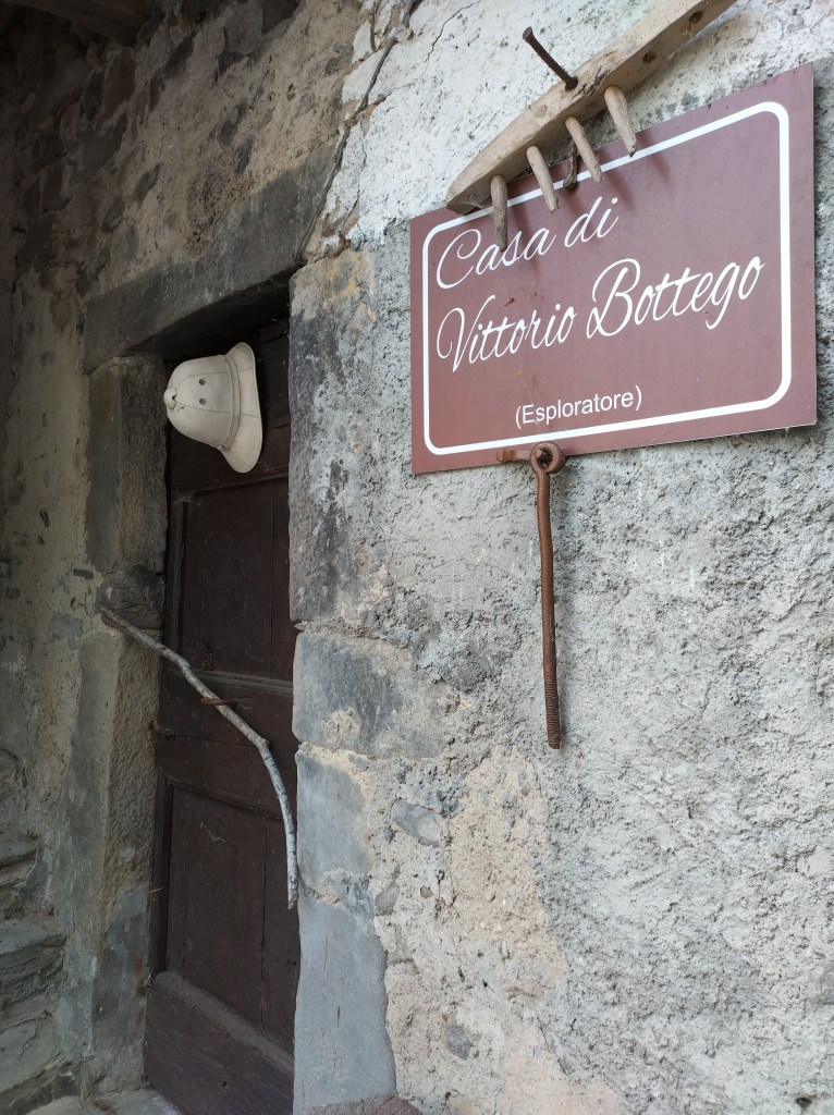 A Costello, ormai alle porte di Albareto, mi trovo in pellegrinaggio improvvisato davanti alla piccola casa natale di Vittorio Bottego. Il bastone e il caschetto dell’esploratore sono appesi all’esterno, davanti alla porta. Una specie di santuario per i viaggiatori e gli inquieti di tutti i tempi.