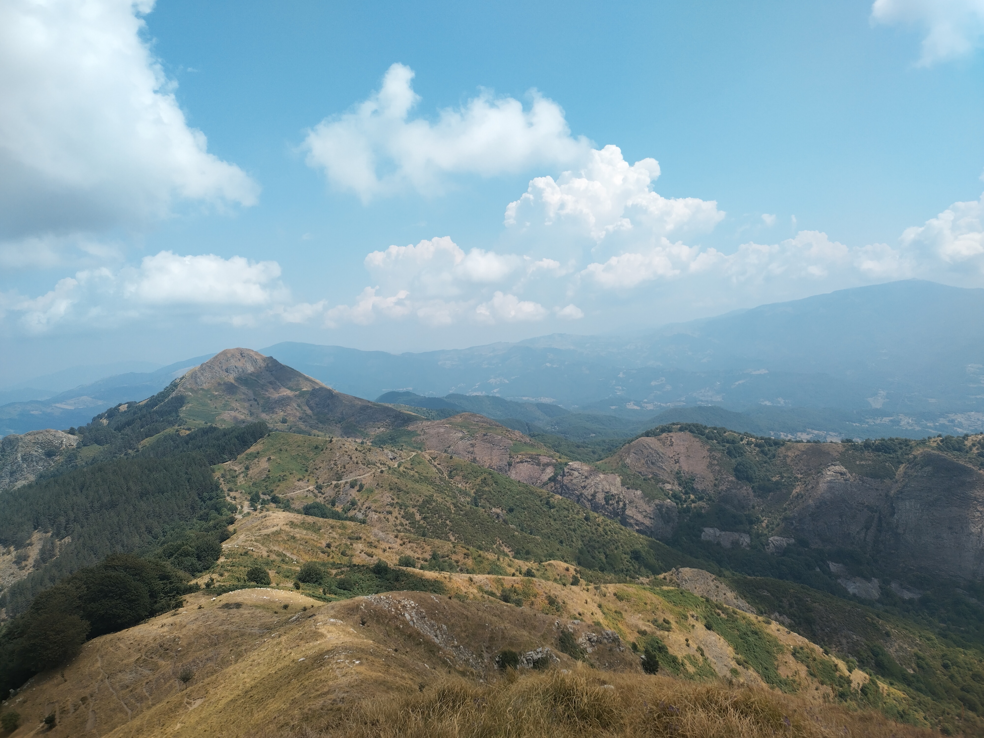 È l’ora più calda di uno dei giorni più caldi di uno degli anni più caldi, e devo affrontare lo strappo ripido che mi porta a 1240 metri, la cima del Monte Porcile. Unica consolazione, le nuvole basse che ogni tanto vengono a ricoprire per qualche minuto il quasi invisibile sentiero.
