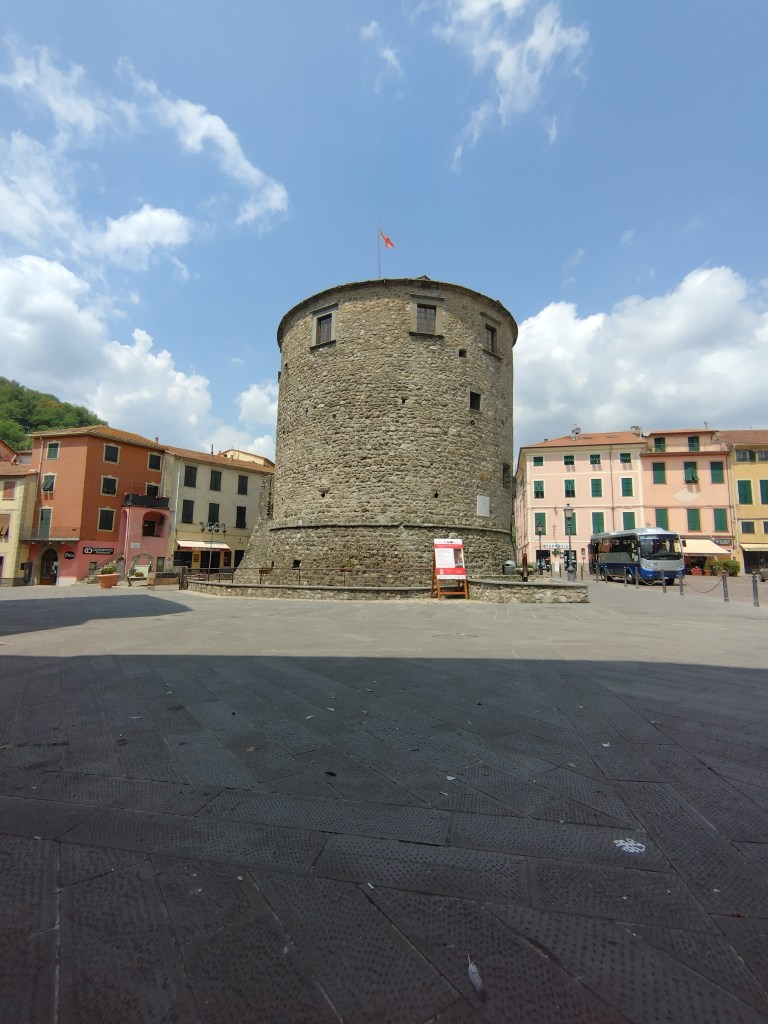 A Bruschi, gruppo di case lungo la strada, mi parcheggia vicino lo scooter un signore che salta fuori essere originario proprio di Borgotaro: che uno dice veh, piccolo no il mondo. Con i suoi migliori auguri e qualche piccola gufata sul fatto di non procurarmi storte, che poi sei pure solo e l’altro giorno ne han dovuto portar via due, riprendo la discesa che mi fa tornare alla civiltà davanti al bel Santuario di Nostra signora del Soccorso in frazione San Bartolomeo, 10 metri sul livello del mare. Prossima tappa la Torre saracena di Punta Manara, 177 metri.