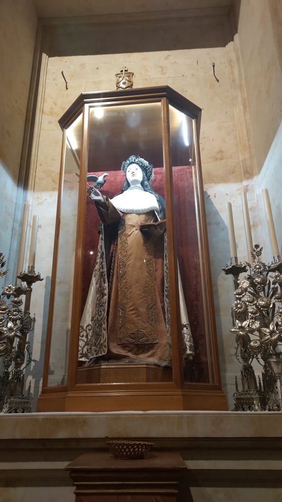 Ma non è per i totem indios che abbiamo preso un treno sotto la pioggia anomala di questo giugno castigliano e raggiunto la cittadina dalle maestose mura dorate. Ávila è legata indissolubilmente a Lei, la ragione per cui ogni cittadina castigliana ha almeno un monastero oltre alle almeno tre cattedrale/basilica/chiesa d’obbligo; l’indiscussa celebrità della spiritualità spagnola, San Francesco senza animali e con più sangue e intrighi; stiamo parlando di Teresa di Ávila, Santa Teresa, che la cittadina natale replica ad ogni angolo anche nelle insegne e nei biscotti. Mentre fuori dal treno scorreva un paesaggio piovoso che sapeva più di Highlands scozzesi che di Castiglia, mi sono in breve appassionato a questa figura seguendone le controverse vicende su Wikipedia, e riportandole a hermano in cambio di uno sporadico “hm hm” e dell’aria contraddetta di chi non è solito alzarsi al mattino presto.