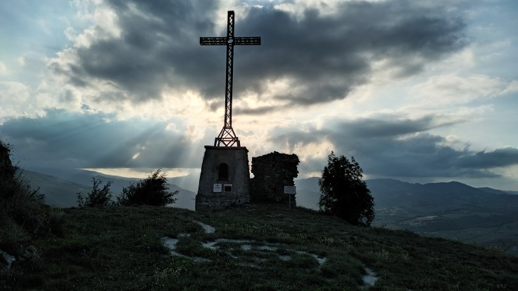 Sul pinnacolo gemello dall’altra parte del paese svetta una grande croce, a poca distanza da un antico monastero di monache agostiniane: sono loro che ad ogni alba e tramonto salutano il giorno nascente o morente con canti di lode e di Pace.